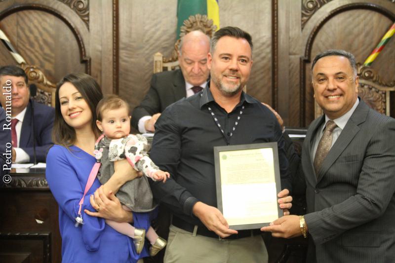 Ao receber a Moção de Aplauso, no Plenário da Câmara Municipal de Bauru, o homenageado esteve acompanhado da esposa, Andreia Marcondes Camargo, da filha Manuella Camargo, e do gerente de Operações da CPFL, José Eduardo Mauad.