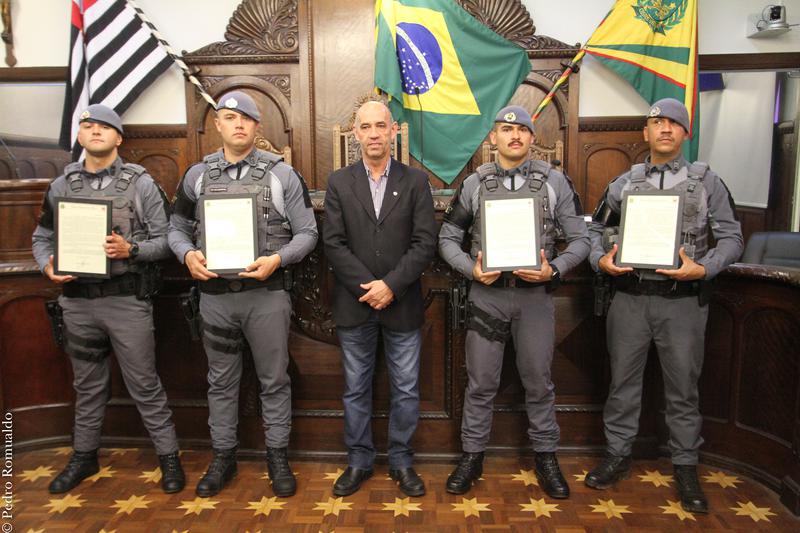 Nesta quinta-feira (27/7), o vereador Coronel Meira (União Brasil) entregou uma Moção de Aplauso ao 1º Sargento PM Thiago Luis de Souza, ao Cabo PM Victor Henrique Felício Trindade, ao Soldado PM Vinicius Ferreira dos Santos e ao Soldado PM João Victor Cassemiro Dias, pela brilhante carreira na Polícia Militar do Estado de São Paulo, com elevado grau de profissionalismo e conhecimento legal.