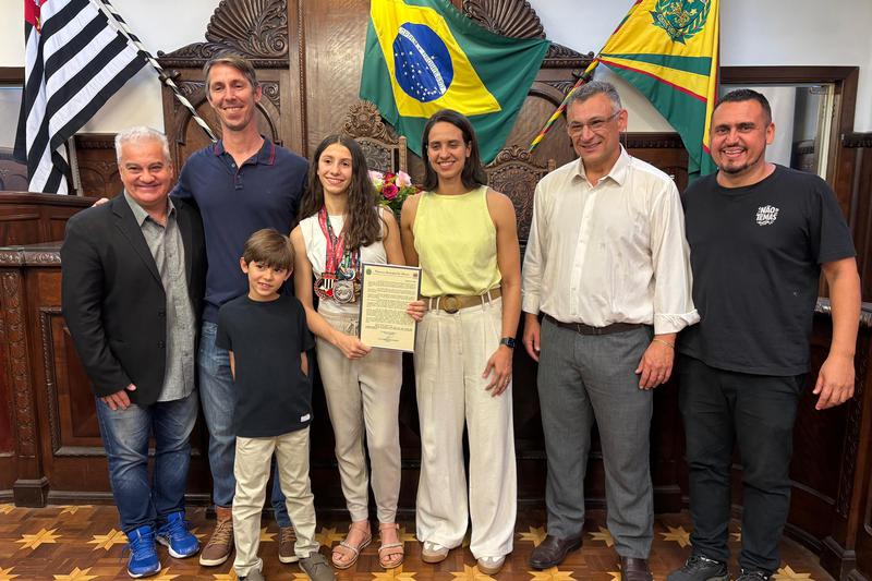 Na tarde desta quinta-feira (09/10), o vereador Eduardo Borgo (Novo) realizou no Plenário “Benedito Moreira Pinto” a entrega da Moção de Aplauso nº 179/2025 à atleta Sofia Rocha Justo Fioretto. A homenagem reconhece as conquistas obtidas no judô, representando Bauru e o Estado de São Paulo nos pódios das principais competições.