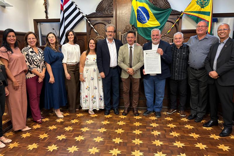 Na manhã desta quinta-feira (09/04), o vereador Dário Dudário (PSD) entregou a Moção de Aplauso n.º 43/2026 ao empresário Paulo Ferreira da Silva, reconhecendo a trajetória de trabalho dele e sua contribuição para o desenvolvimento econômico de Bauru.