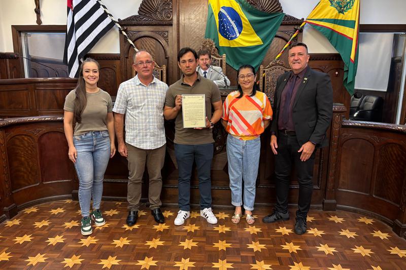 Na manhã desta quinta-feira (09/04), o empresário David Marques recebeu a Moção de Aplauso n.º 39/2026, proposta pelo vereador Dário Dudário. A homenagem reconhece a história inspiradora e o relevante papel dele no fortalecimento do empreendedorismo local.